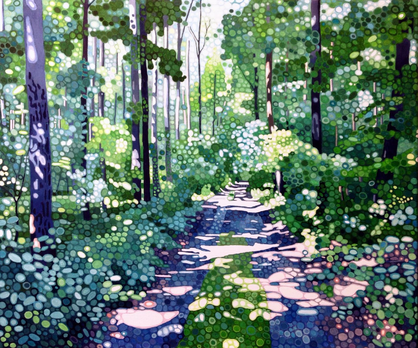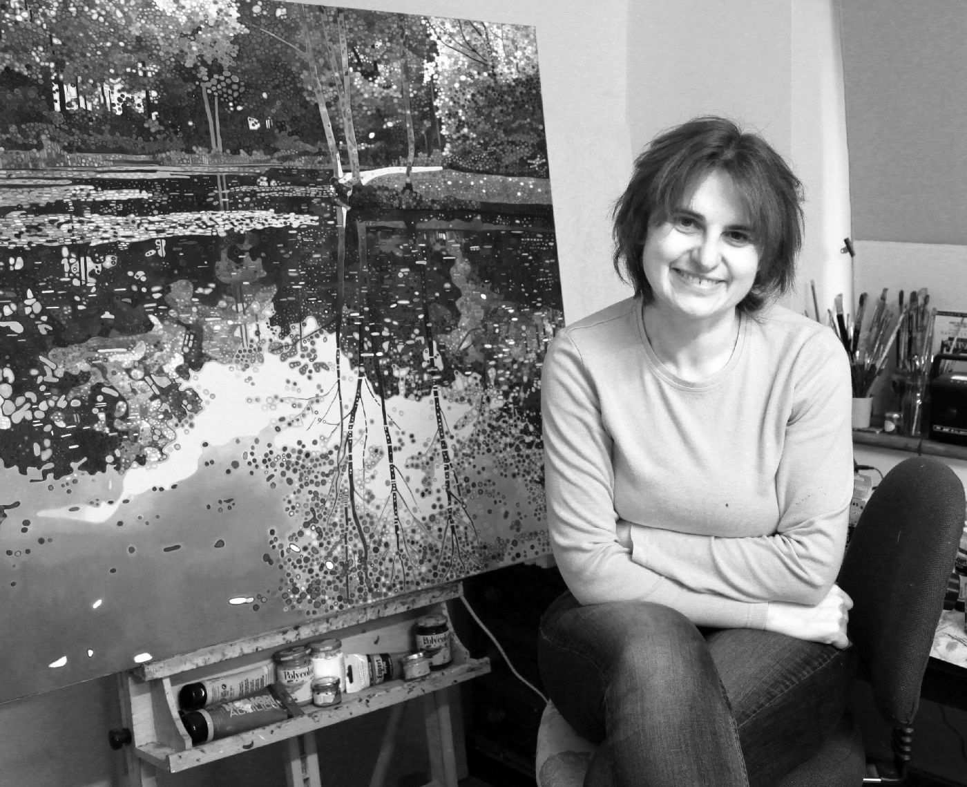 Ewa Adams is a landscape painter. Her painting is a contemporary take on Pointillism. She builds her images out of circles of pure colour juxtaposted next to one another, and when viewed from the distance an optical interaction, a mixing of colours, is created by the eye of the spectator. Her painting technique is a slow, repetitive and meditation-like process. The result is a distinctive work of incredible freshness, vibrancy and luminosity. The humble landscapes are elevated, they glow witht uplifting energy, they buzz with life.Her pallet is bright and bold, her understanding of the tone and colour interrelations is second to none. Her images are full of joy and optimism. With paint she creates form, movement, sense of distance and light. She captures the beauty of the familiar world. Unremarkable becomes remarkable.